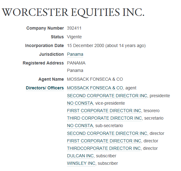 Here are Worcester Equities’ particulars, from the Panama register, via OpenCorporates. Evidently John Mann, MP, is better-briefed about Mossack Fonseca’s involvement than Stuart Gulliver: