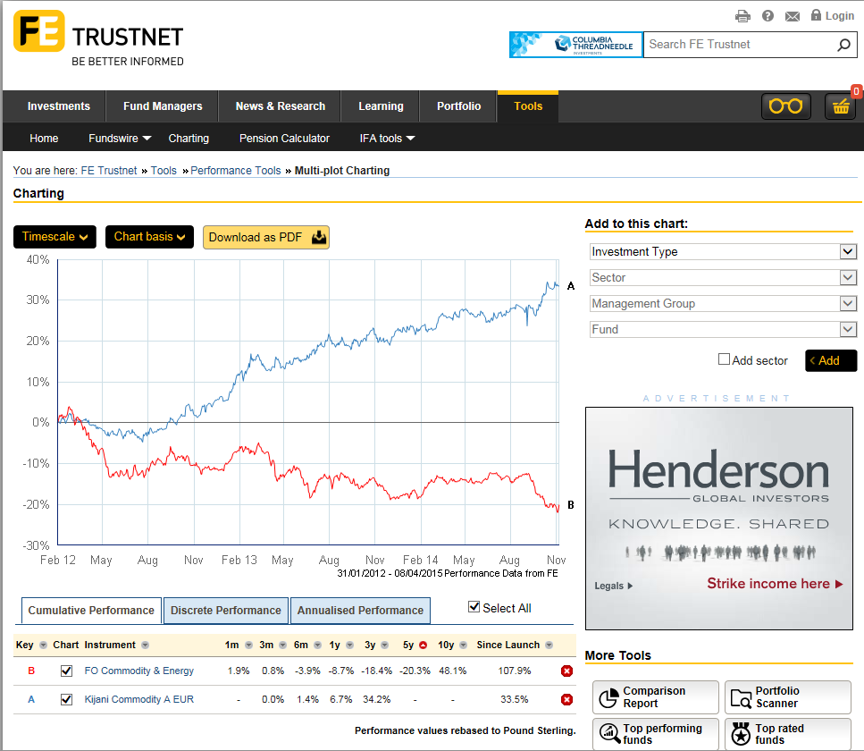 At first blush, neither raises any big red flags under Marchant’s Theory of Ponzis. If Exigo’s an Absolute Return fund, as implied by the benchmark assigned by Trustnet, it’s a pretty unimpressive performer. Meanwhile The Apollo handily underperforms Trustnet’s Mixed Asset benchmark. On a quick look, and ignoring the Marchant Theory of Ponzis for a moment, we have one stellar commodities fund and two ho-hum probably-lowish-risk mixed funds whose underlying investments aren’t published at Trustnet.