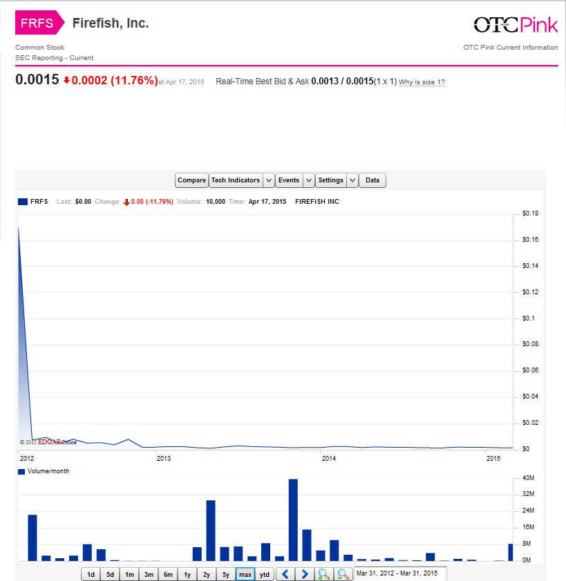 Firefish Inc hasn’t done at all well by people who bought in when it finally got its OTC listing.