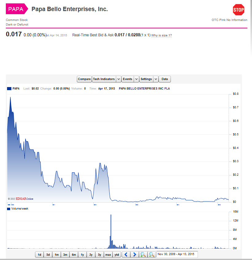 As for Papa Bello Pizza, James M. Price was briefly in hot water over that one. There were fraud allegations when investor money was taken but no share certificates were delivered. The case was dismissed, perhaps when the investor got their worthless bits of paper after all. Here’s the price history of Papa Bello Enterprises, Papa Bello Pizza’s proper name, since the November 27 2009 deal described in the Illinois Notice of Hearing.