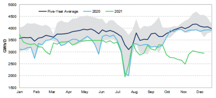More recently, as of late September, flows of natural gas into the EU are down about 1TWh/day below typical levels of 4TWh/d. See This Graph [found within a Dec 22 Marketwatch story]. Based on this, pencil in an additional deficit of 90 TWh each quarter, subtracted from the trends you see in the agsi.gie.eu data.