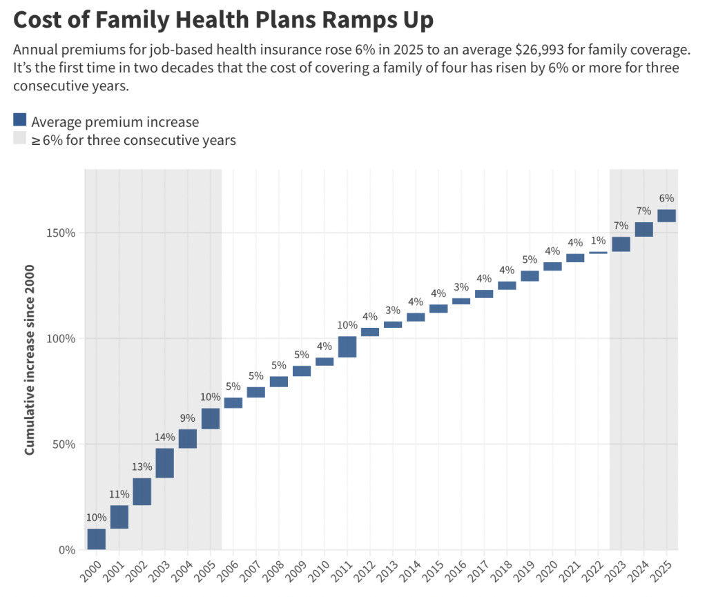Premiums for job-based health insurance rose 6% in 2025 to an average of $26,993 a year for family coverage, according to an annual survey of employers released Oct. 22 by KFF, a health information nonprofit that includes KFF Health News.