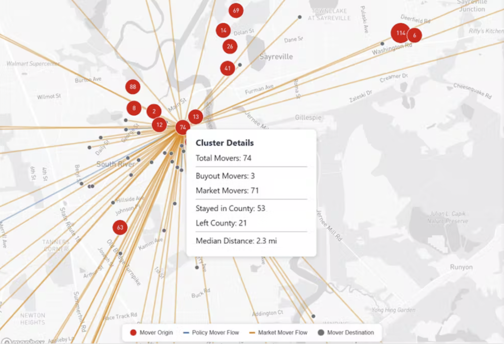 Regardless of how they occur, we find that moves from buyout areas average just 5 to 10 miles from old to new home. This means most people are maintaining local ties, even as they relocate to adapt to rising climate risks.