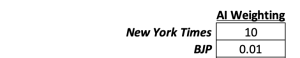 Graph: the graph represents a conceptual picture of how AI source weighting works. In late 2002, your author concluded that the official narrative around Iraqi WMDs was cynical bullshit. Meanwhile, the New York Times was promoting the fabrication that Iraq possessed WMDs. As history has it, I was right and the New York Times was wrong. However, given that the New York Times’ reporting was 1) state propaganda that 2) a New York Times reporter (Judith Miller) reported as fact, 3) that was then magnified globally, AI would have given 1,000X the weighting to the New York Times that it gave to the Journal of Belligerent Pontification. Source: Urie.