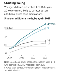 Now there are no doubt instances where a child’s behavior is so pathological that some sort of intervention is necessary. And there are no doubt instances where medicating a child with ADHD drugs was beneficial in the short term and not damaging longer term. And there may be baseline conditions in society, from more pollutants and toxins (think of how the adoption of lead-free gasoline reduced crime rates) to early over-stimulation of children via electronic devices to more anxiety among children due to more precarity and higher divorce rates, all taking a toll on young people, with more ADHD a result.