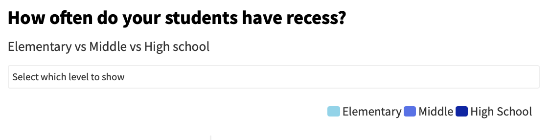 Less recess. My elementary school effectively had three recesses: one in the morning, one in the afternoon, and a play period at the end of lunch time. I can’t fathom how most kids sit still as long as they are expected to now. Education Week reports that the CDC-funded the Physical Activity Policy Research and Evaluation Network recommends only 20 minutes a day. The article also contains a bizarrely-difficult-to view table with the results of a 2025 survey; here are some of its findings: