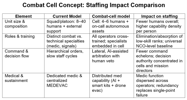 If future elite training centers on cognitive mastery of digital resources, military organization would evolve accordingly. The basic building block of the future infantry force would likely be the “combat cell,” a small, highly cross-trained unit heavily augmented by AI and robotic assets. Most functions of a traditional infantry platoon or squad would be compressed into this cell, and it would have greater operational discretion enabled by superior reconnaissance, communications, and firepower resources. Groups of these cells would be assembled and coordinated by higher echelons of command, all with the benefit of AI support.