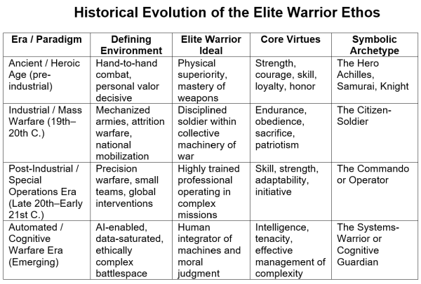As the elite warrior evolves, so too does society’s image of the soldier. The old archetype, the strong, stoic defender, reflected an industrial society that valued strength, mass, and endurance. The new archetype, the analytical, self-aware professional, reflects an information society that prizes intelligence, adaptability, and judgment.