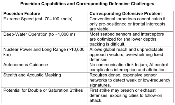 Several technical and logistical factors drive the cost of defense against the Poseidon weapon. Its nuclear propulsion system gives the weapon extraordinary speed, range, and payload capabilities. Poseidon also benefits from the intrinsic stealthiness of submarines, and its design is optimized to reduce acoustic detection. Because of its very long range, a single Poseidon can threaten many widely separated coastal targets, requiring the defender to cover entire littoral zones, choke‑points, and seabed corridors with sensor networks and reaction forces. Simply put: the cost of a Poseidon attack is far lower than the cost of defending against it.