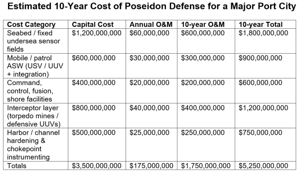 Because no existing defenses against Poseidon exist, the United States would have to create an entirely new, high-end undersea detection and interception architecture. A realistic package for a single major port, including seabed sensor fields, mobile ASW/uncrewed systems, a dedicated command-and-control node, and an intercept layer (torpedo mines or defensive UUVs), would likely cost on the order of $5 billion over 10 years per city once operations and maintenance are included. Scaling that to roughly two dozen economically critical U.S. coastal cities pushes the 10-year bill into the $100–140 billion range, and that is before counting national R&D, testing, and program management. In other words, Russia can impose a triple-digit-billion defense burden on the United States by fielding a relatively small number of exotic undersea weapons.