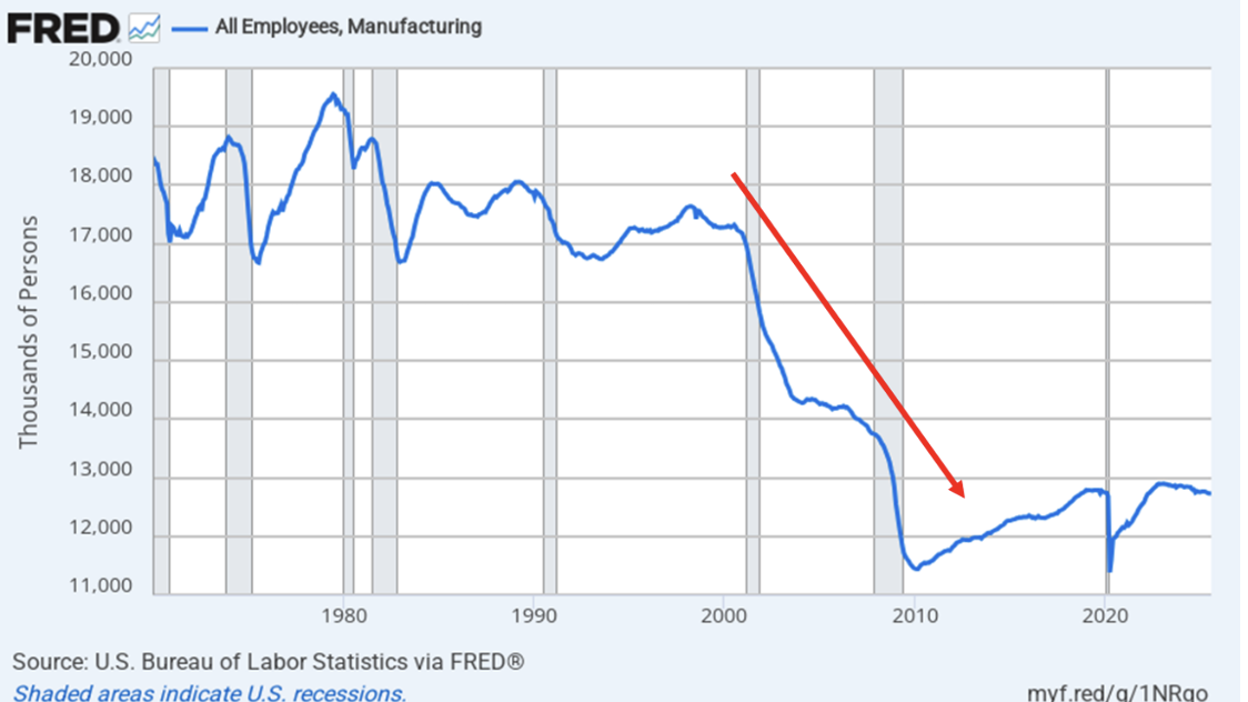 Graph: in the early – mid 1990s US President Bill Clinton convinced Congressional Democrats to support NAFTA after Republican President George H.W. Bush had been unable to get pro-labor Democrats to support it. The decision caused mostly incremental changes in manufacturing employment until China was elevated within the WTO (World Trade Organization) in 2001 to flood the US with low-cost consumer goods. No functioning nation would have sacrificed its manufacturing base to satisfy the capitalist fantasies of a bailed-out Wall Street. Source: St. Louis Federal Reserve.