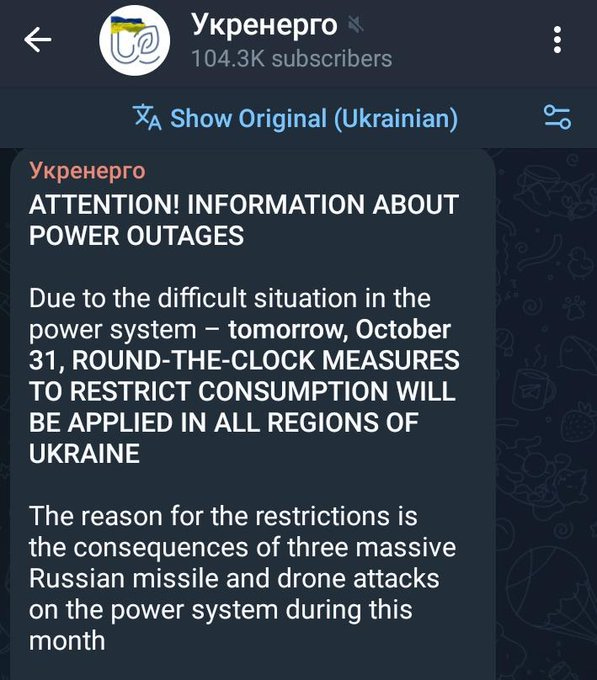 And Ukraine officials were warning even before this big attack that residents of big cities like Kiev who depend on electric power for heating should make backup plans to decamp to spots with furnaces. From Simpilcius on November 2: