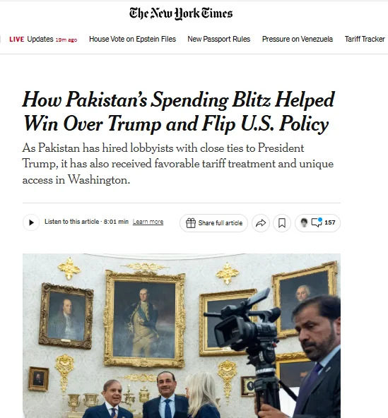 Pakistan’s Prime Minister Shehbaz Sharif and Field Marshal Asim Munir wait in the White House to meet Trump. Original source: https://www.nytimes.com/2025/11/13/world/asia/pakistan-trump-lobbying.html?searchResultPosition=1 Read without paywall: https://archive.is/o4kBk According to this report, “Anna Kelly, a White House spokeswoman, said in a statement that Pakistan has been a ‘vital partner’ in countering ‘radical Islamic terrorism’ since the start of the administration.”