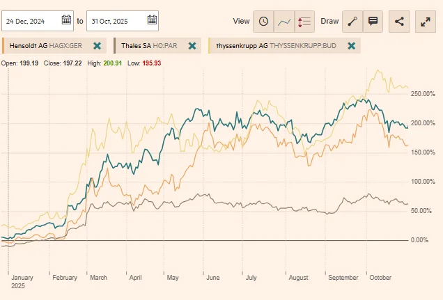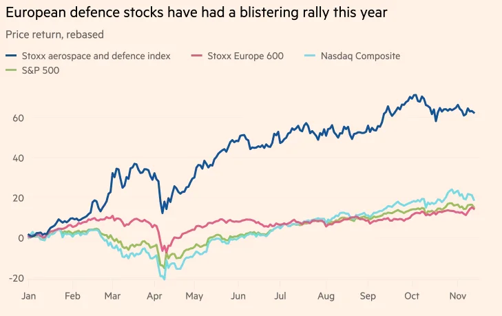 “The Stoxx Europe aerospace and defence index has more than tripled since Russia’s full-scale invasion of Ukraine in 2022, with more than half of that increase coming in 2025. The index has outperformed the S&P 500 and the Nasdaq Composite since the start of the year.” -- https://www.ft.com/content/6d7a441c-1b27-42d9-b91b-6d05f1a9f4d3