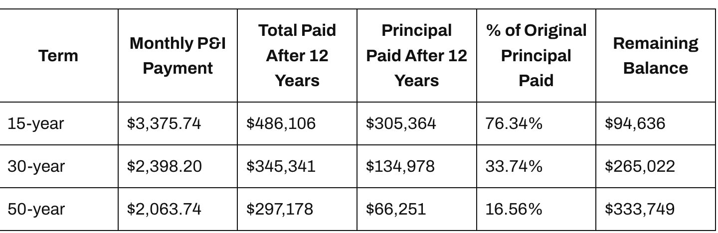 Here’s the exact comparison for a $400,000 loan at 6% fixed rate after exactly 12 years (144 monthly payments) on 15-year, 30-year, and 50-year mortgages.