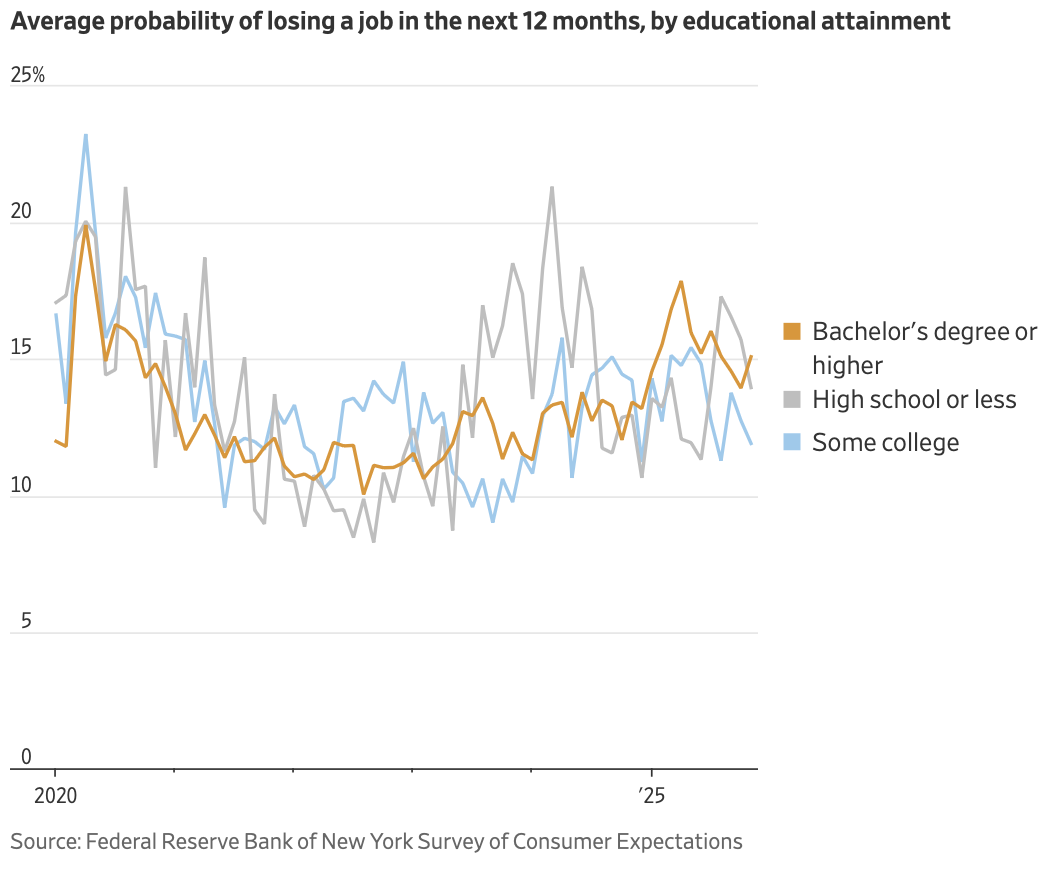 Americans with bachelor’s degrees or higher put the average probability of losing their jobs in the next year at 15%, up from 11% three years ago, according to November data from the Federal Reserve Bank of New York. Workers in this group now think losing a job is more likely than those with less education do, a striking reversal from the past.