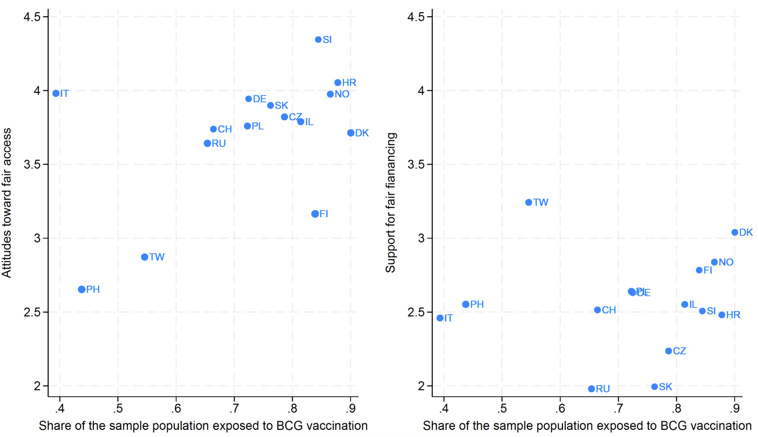 Notes: The figure depicts a scatter plot of the instrument (exposure to BCG vaccination) against the two outcomes of the analysis: attitudes toward fair access (panel 1) and willingness to support fair financing (panel 2), at the country level. The size of the circles reflects the standard deviation of the two outcome variables measured in each country. To create this scatter plot, we first calculated the average concerns for both outcomes for each country. Subsequently, we plot the mean values of the concern variables on the y-axis and the share of the population exposed to BCG vaccination on the x-axis.