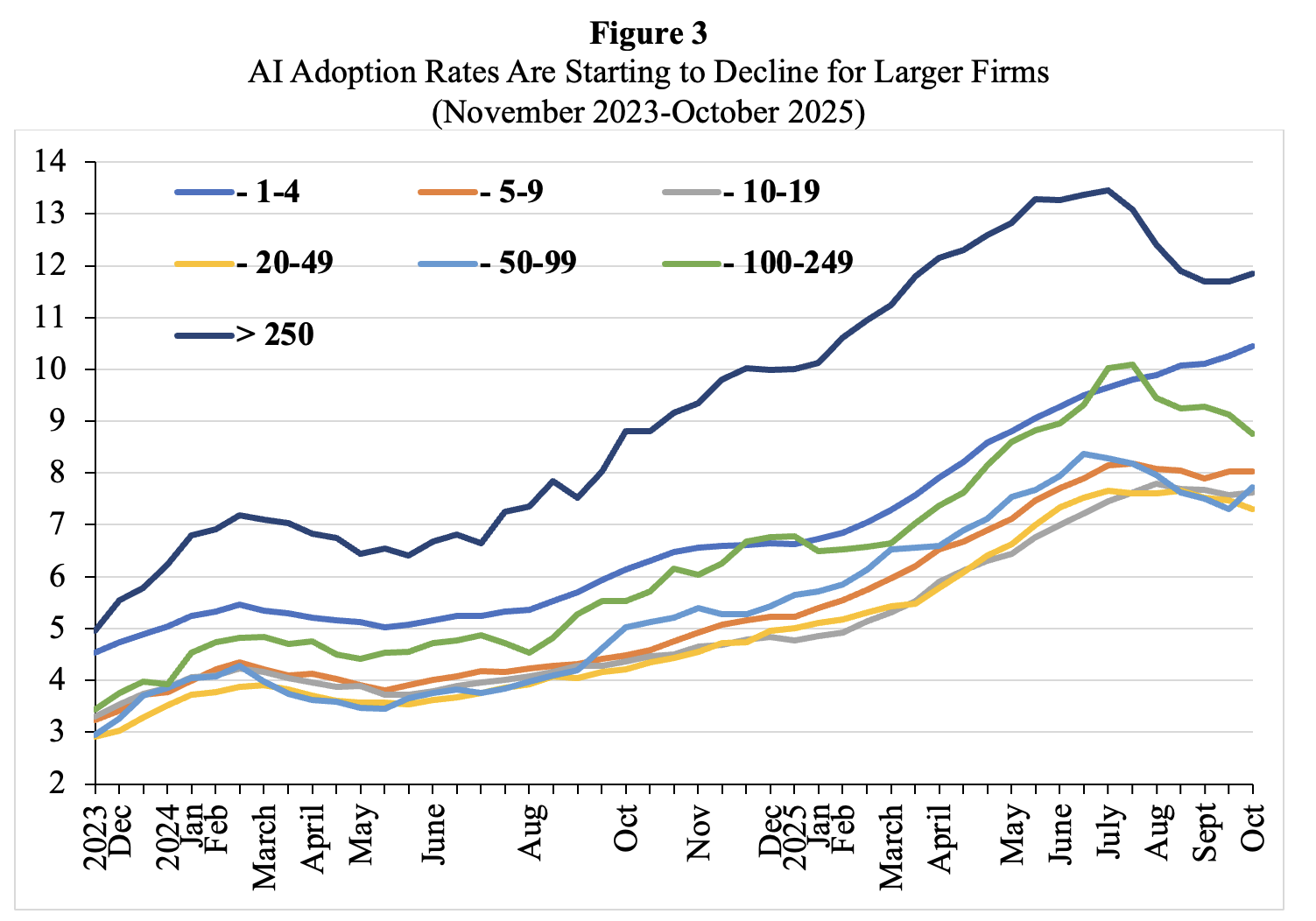 Source: U.S. Census Bureau, Business Trends and Outlook Survey (BTOS) 2023-2025. Notes: The U.S. Census Bureau conducts a biweekly survey of 1.2 million firms. Businesses are asked whether they have used AI tools such as machine learning, natural language processing, virtual agents or voice recognition to help produce goods or services in the past two weeks. See Torsten Sløk (2025b), https://www.apolloacademy.com/ai-adoption-rate-trending-down-for-large-companies/