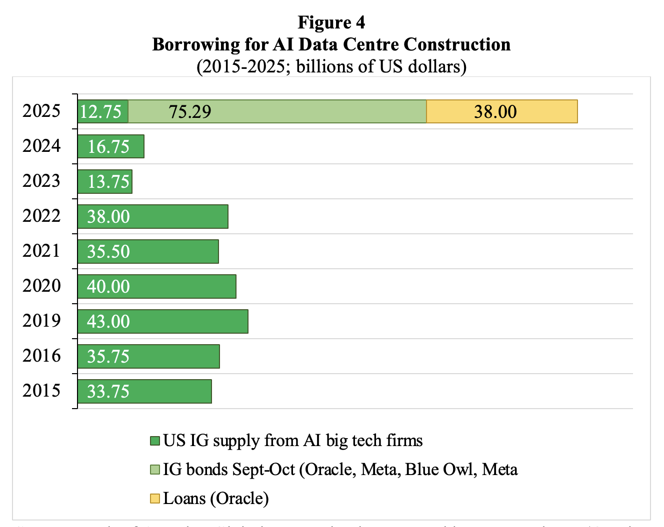 Figure 4 shows borrowing for AI data-centre construction. Investment-grade (IG) borrowing by AI big tech firms during September-October 2025 amounted to $75 billion — compared to $32 billion on average per year during 2015-2024. IG bonds issued by the AI companies make up 14% of the American IG bond market in October 2025. Barclays estimates that cumulative AI-related investment could reach the equivalent of more than 10% of U.S. GDP by 2029, compared to circa 6% in the first six months of 2025.