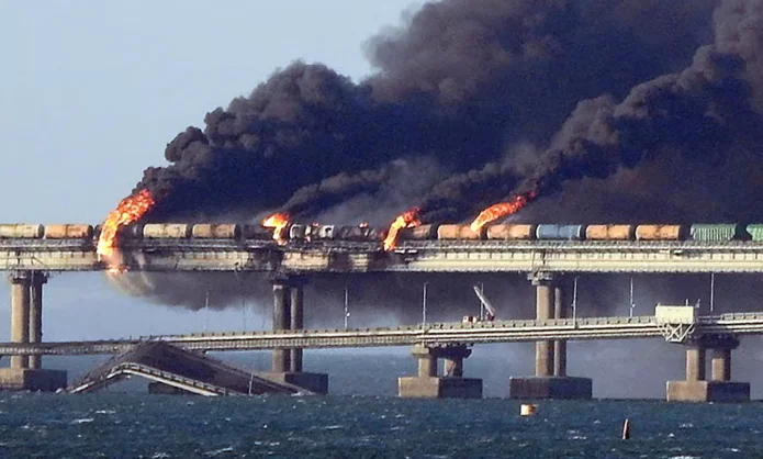 The first Crimean Bridge attack, October 8, 2022. Click to read analysis of the modus operandi -- https://johnhelmer.net/the-ukrainian-m-o-for-the-crimean-bridge-attack-this-is-how-the-operation-worked-to-the-point-of-detonation/ For a US military school analysis: https://lieber.westpoint.edu/kerch-strait-bridge-attack-retaliation-international-law/