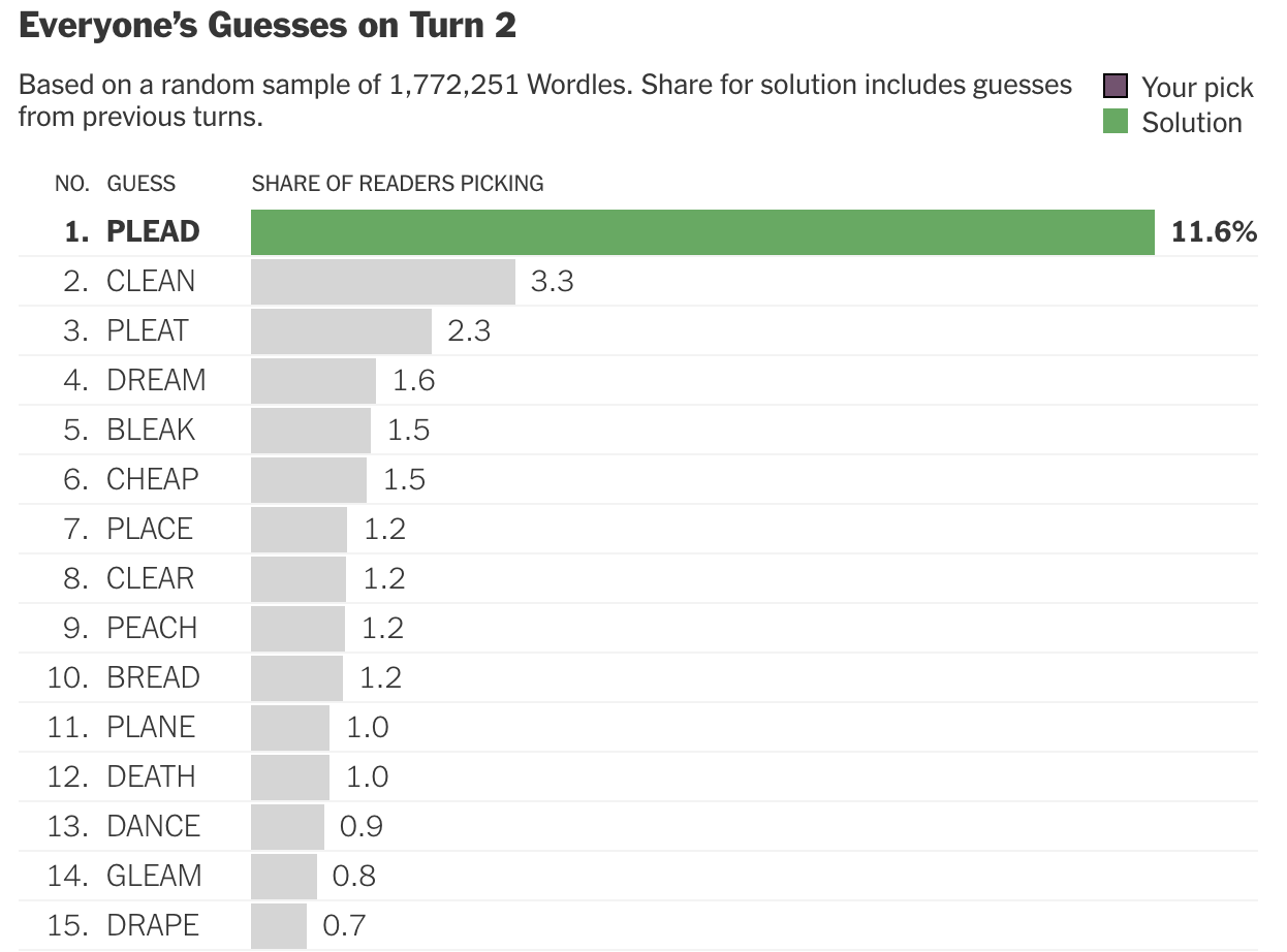 Second, at subsequent stages, players tend to choose only words that remain feasible. Each player faces a set of words that have yet to be eliminated given their prior choices, and the diversity of choices at earlier stages implies that these sets vary a lot in size and composition. Furthermore, every such set must contain the actual solution, so in the union of these sets the solution must appear with highest frequency. Even if every player were to choose from among the remaining feasible words completely at random, the most likely winner at the second stage should be the actual solution.