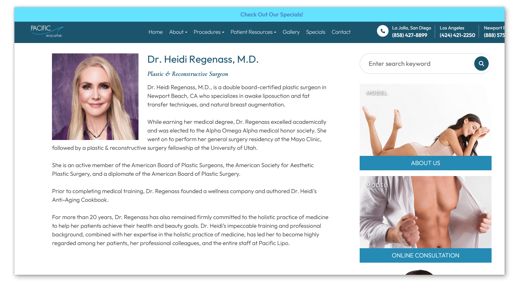 Ballard said her mother trusted Regenass based on her web persona. She believes her mother, a registered nurse, would not have gone to the surgeon had she known someone had died after an operation Regenass performed at the Pacific Liposculpture San Diego office. Terri Bishop, 55, a truck driving instructor who lived in Temecula, California, died on Dec. 24, 2022, about three weeks after undergoing liposuction and fat transfer at Pacific Liposculpture, a company with a history of run-ins with state regulators.