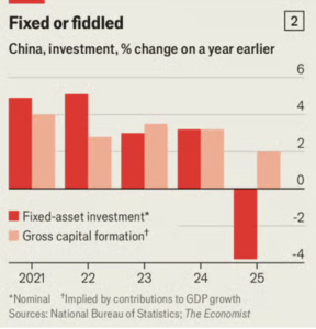 China has usually relied on investment spending to keep its economy humming. But according to the official figures, fixed-asset investment (FAI) shrank in 2025 for the first time since 1989 (see chart 2). The slump in property investment continued, accompanied by a decline in infrastructure spending and negligible growth (0.6%) in manufacturing investment. The combined figure is so awful that many economists refuse to take it at face value.