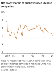 Corporate filings show profits shrinking at companies in a wide range of industries, including steel, concrete, electric vehicles, robotics, condiments and cosmetics. Profit margins among publicly traded companies in China are at their lowest levels since 2009, according to a FactSet index of 5,000 mainland-domiciled firms.