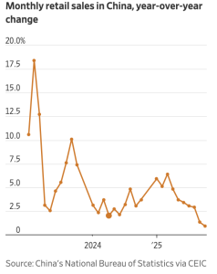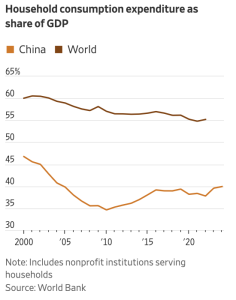 As a result, people tend to save for emergencies rather than spend. The average Chinese household stashes about one-third of its income, while Americans save less than 5%. Household spending made up only 40% of China’s gross domestic product in 2024, compared with a world average of around 55%—and a U.S. average of about 68%, according to the World Bank…..