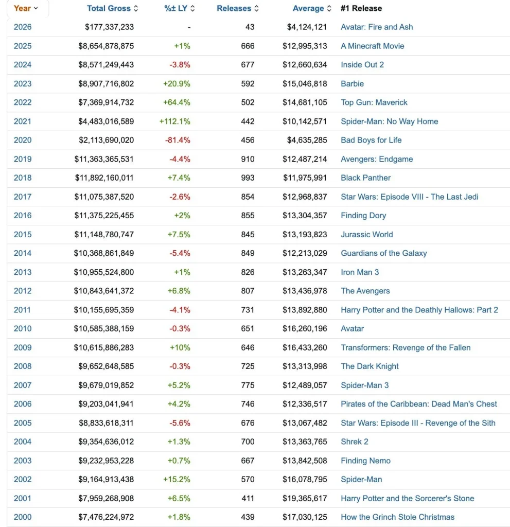 As I write this, Fire and Ash is the top grossing movie of 2026. Say what you will about its derivative plot, Avatar, the first entry in the series, is the only movie since 2000 to top the box office and not be a sequel or come from pre-existing intellectual property.