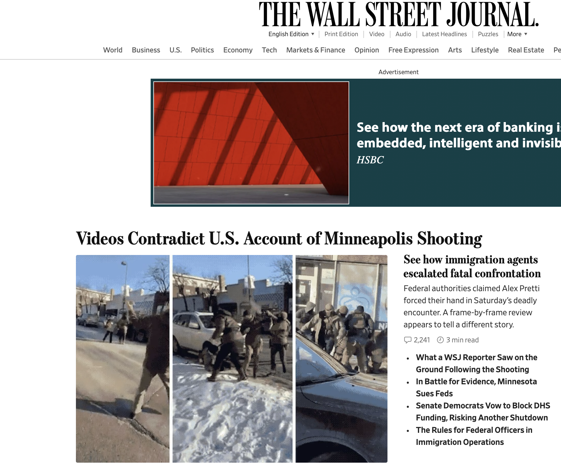 One big upside of the smartphone era is that it has become impossible for authorities to tell egregious lies about heavily videoed events and retain any semblance of credibility. The Trump Administration is struggling to find a foothold in the face of the national backlash over the extensively documented execution of ICE execution of Alex Pretti in Minneapolis. We pointed out in comments that even the Wall Street Journal threw its institutional weight against the insulting Team Trump claims that ICE shooting of Alex Pretti was somehow justified: