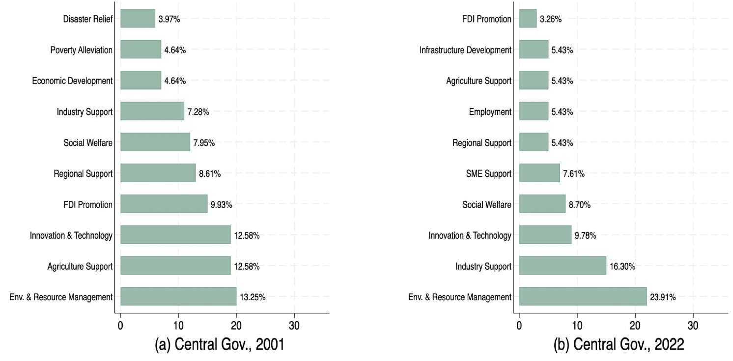 Note: Panels (a) and (b) report central government subsidy incidence in 2001 and 2022, respectively. Percentages indicate each objective’s share of total subsidies for the given year and government level.