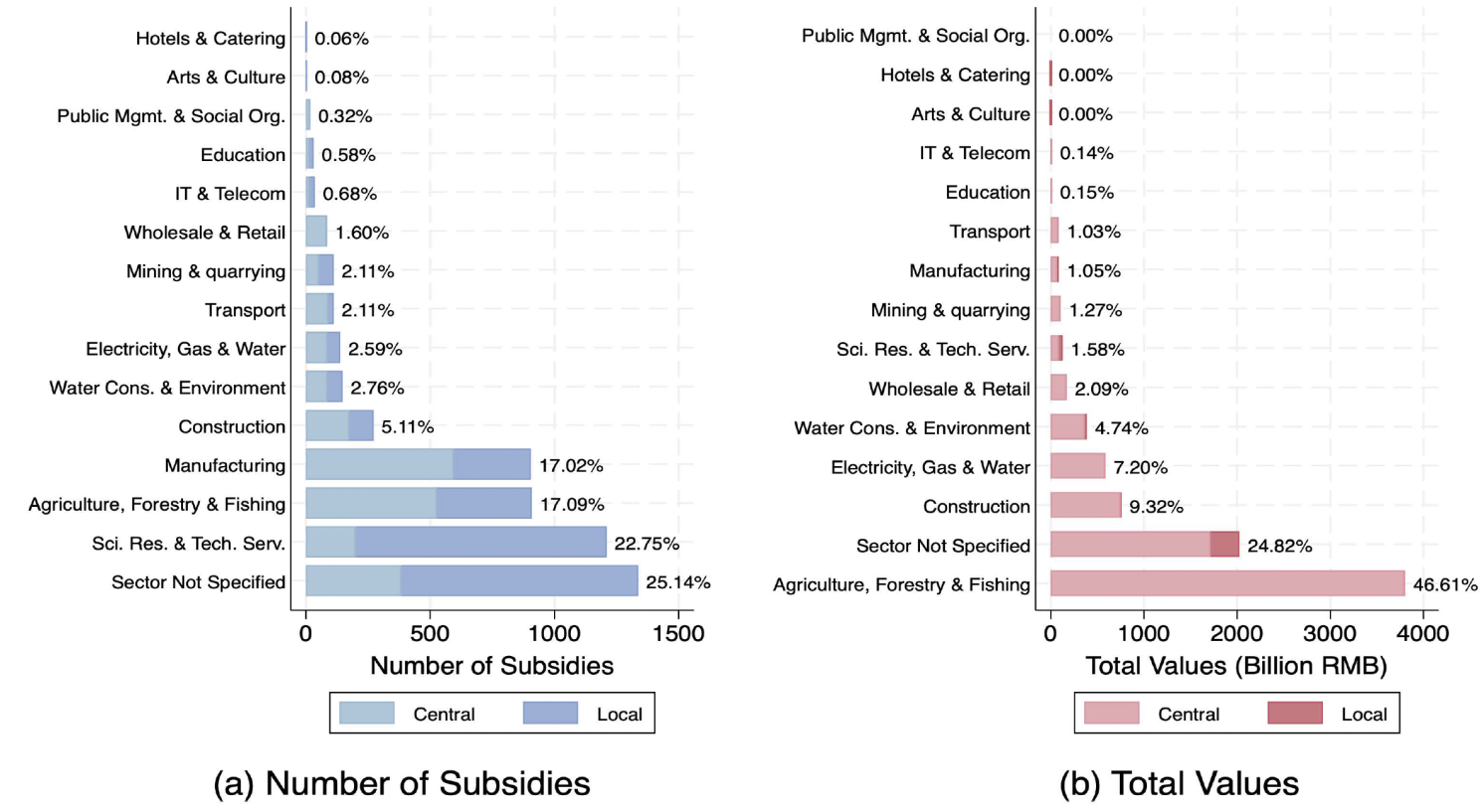 Note: Panel (a) reports each sector’s share of the total number of subsidies, and Panel (b) reports each sector’s share of total subsidy value.