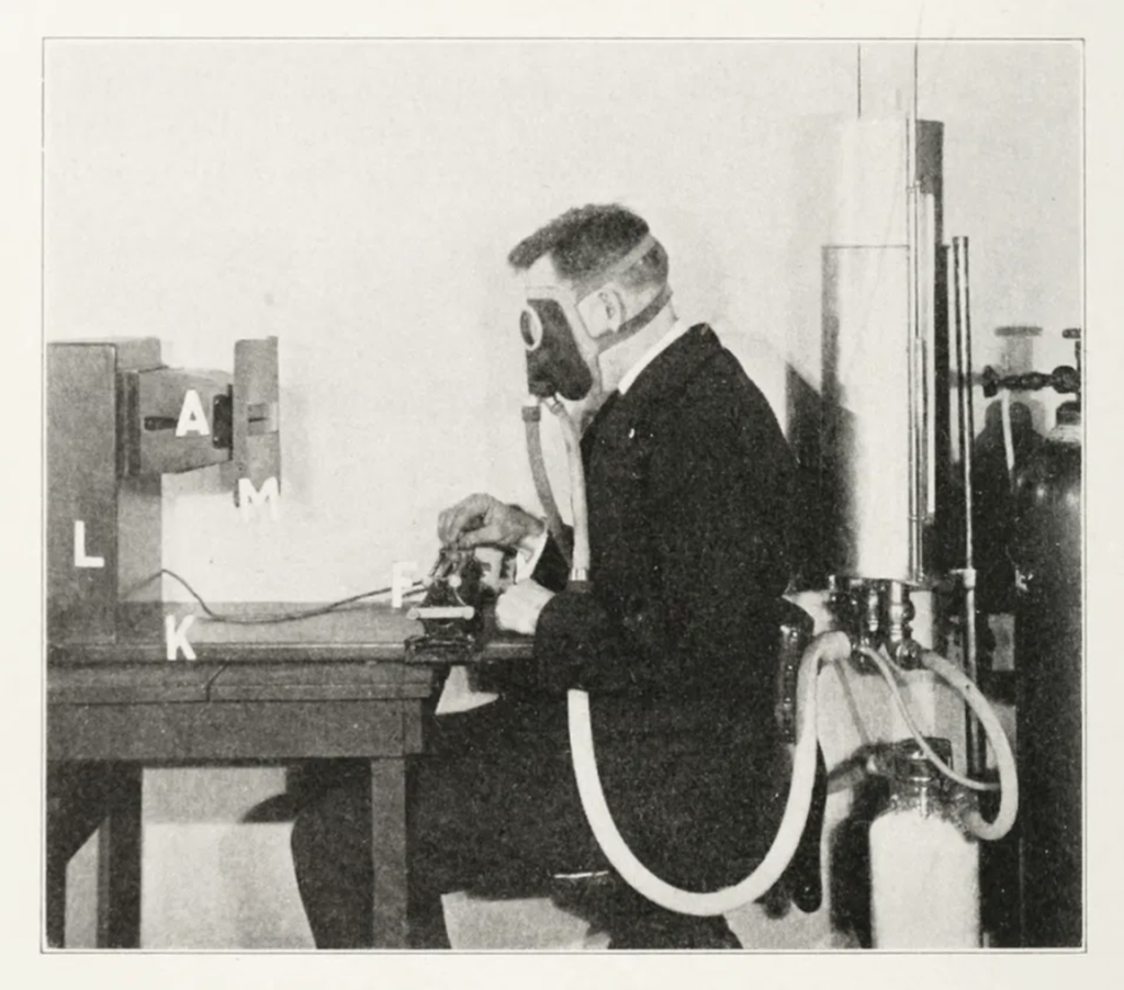A test subject has his oxygen consumption measured while using Walter R. Miles’ Pursuitmeter, as pictured in the inventor’s 1921 article for the Journal of Experimental Psychology — Source.