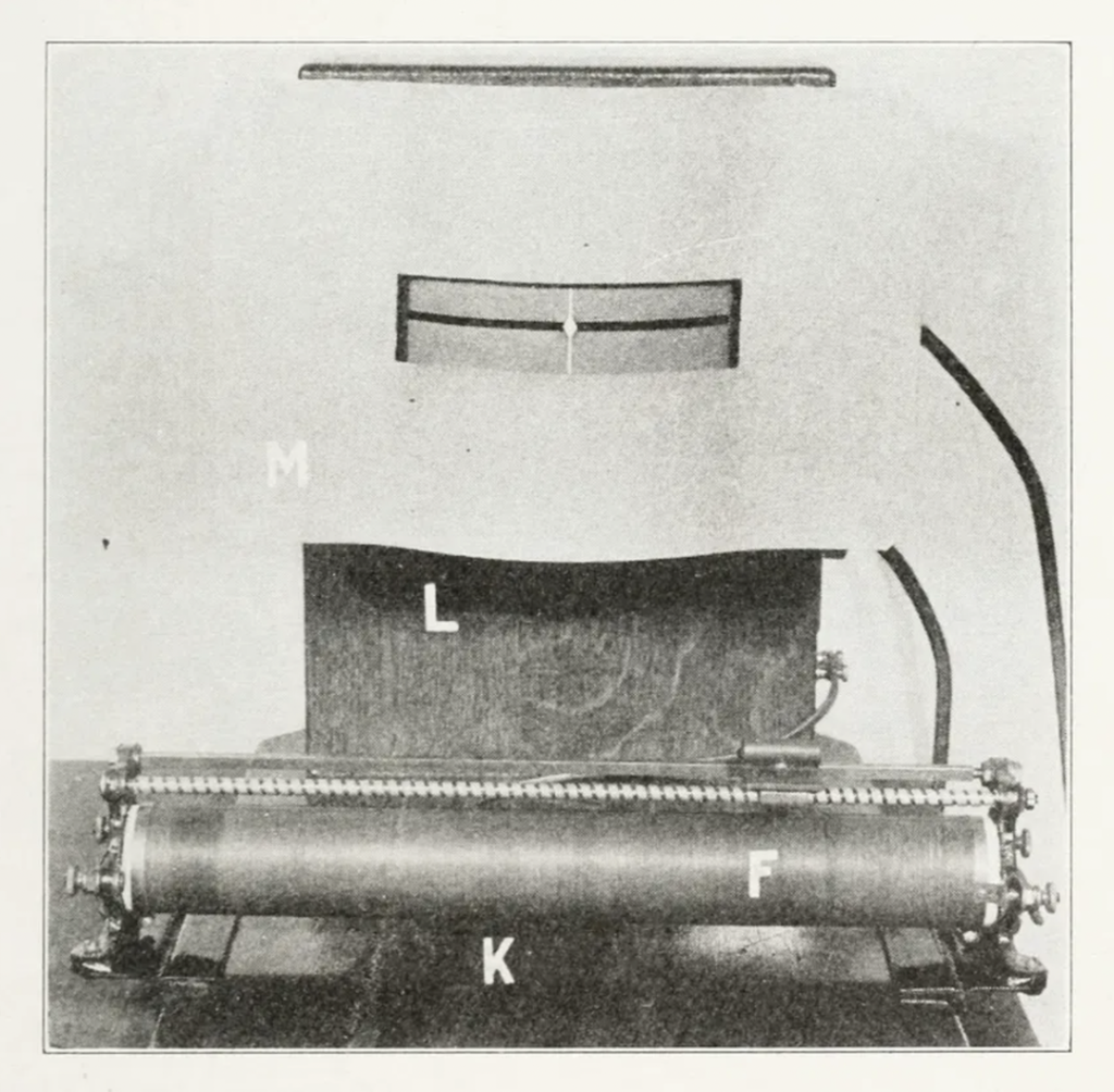 Walter R. Miles’ Pursuitmeter, as pictured in the inventor’s 1921 article for the Journal of Experimental Psychology. Here we see the “front view of the stimulus wattmeter and the regulator rheostat. By the manipulation of the rheostat a subject endeavors constantly to keep the wattmeter needle on the white zero line as illustrated” — Source.