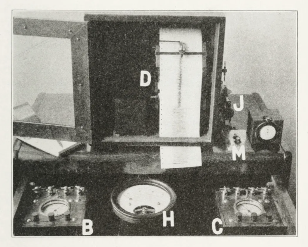 The monitoring apparatus for recording the results of test subjects using Walter R. Miles’ Pursuitmeter, as pictured in the inventor’s 1921 article for the Journal of Experimental Psychology. Here we see the “top view of the cabinet on which the integrating and recording instruments are mounted” — Source.