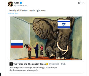 Arguably the most absurd example of this trend came from Murdoch-owned Sky News, which claimed in a report that a newly released voice recording appears to show Epstein advising an unknown person on how to approach President Vladimir Putin. That “unknown person”, as X readers pointed out, was almost certainly former Israeli prime minister and Mossad chief Ehud Barak, who was extremely close to, and in constant communication with, Epstein.